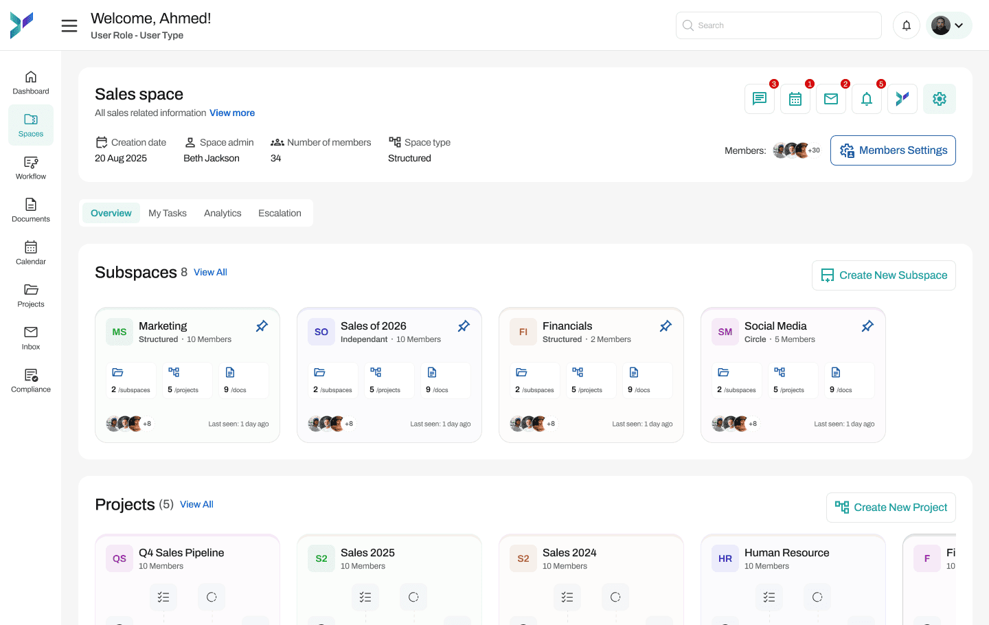One structured workspace where teams, projects, documents, conversations, and decisions live together — with clear ownership and boundaries.